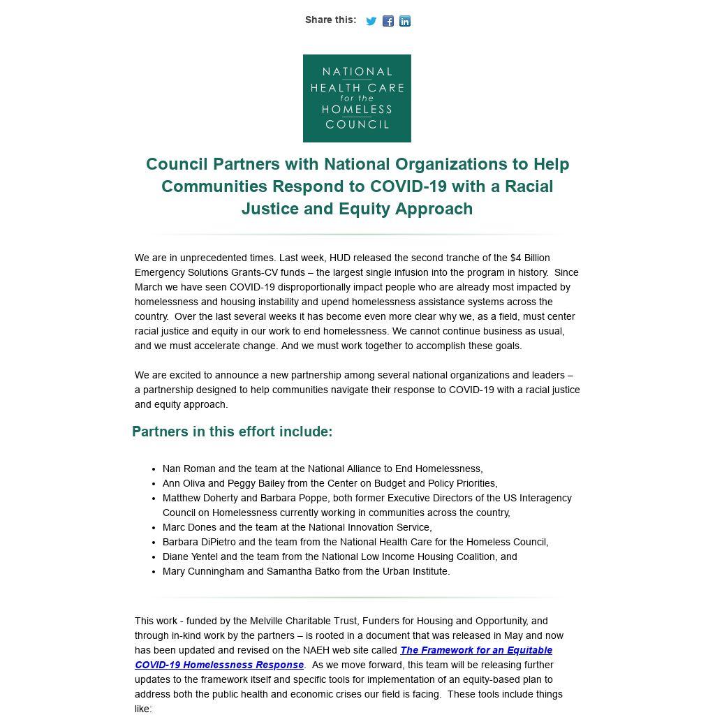We are in unprecedented times. Last week, HUD released the second tranche of the $4 Billion Emergency Solutions Grants-CV funds – the largest single infusion into the program in history. Since March we have seen COVID-19 disproportionally impact people who are already most impacted by homelessness and housing instability and upend homelessness assistance systems across the country. Over the last several weeks it has become even more clear why we, as a field, must center racial justice and equity in our work to end homelessness. We cannot continue business as usual, and we must accelerate change. And we must work together to accomplish these goals.
