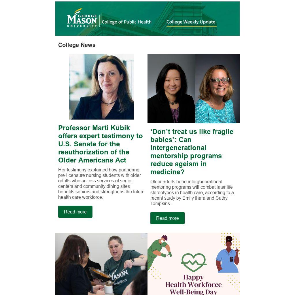 The 2024 CPH Degree Celebration will be held on Saturday, May 11 from 2–4 pm. We need volunteers (Marshals) from each department to lead in and sit with their students. Please note, these positions require regalia. We also need volunteers to help with the flow of the degree celebration. Email Alma Detten at adetten@gmu.edu with questions.