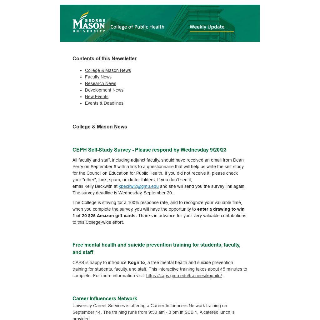All faculty and staff, including adjunct faculty, should have received an email from Dean Perry on September 6 with a link to a questionnaire that will help us write the self-study for the Council on Education for Public Health. If you did not receive it, please check your "other", junk, spam, or clutter folders. If you don’t see it, email Kelly Beckwith at kbeckwi2@gmu.edu and she will send you the survey link again. The survey deadline is Wednesday, September 20.