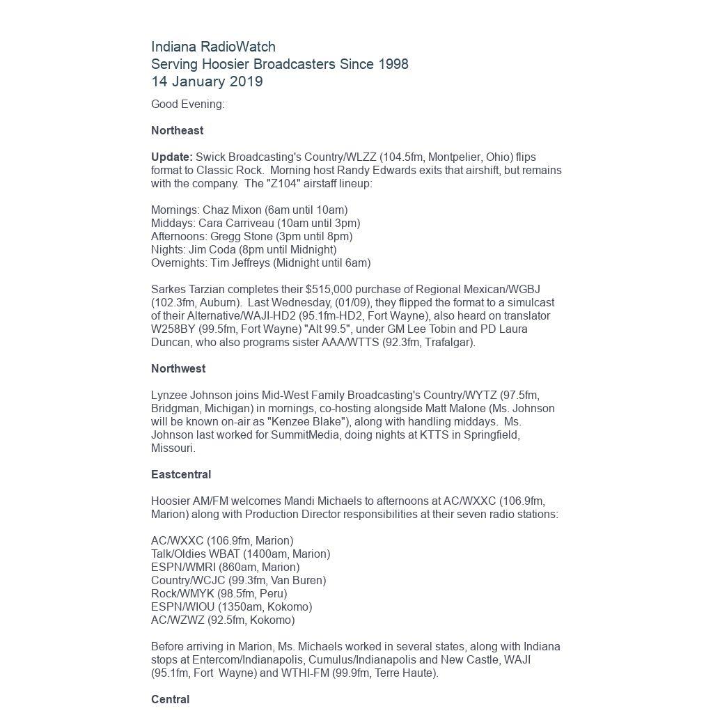 Indiana RadioWatch subscriptions are free. To subscribe, send an e-mail to irw@well.com and we'll add you. After publication, we archive Indiana RadioWatch on the Indiana Radio Archive at http://www.indianaradio.net. Please e-mail us your news stories and employment opportunities.