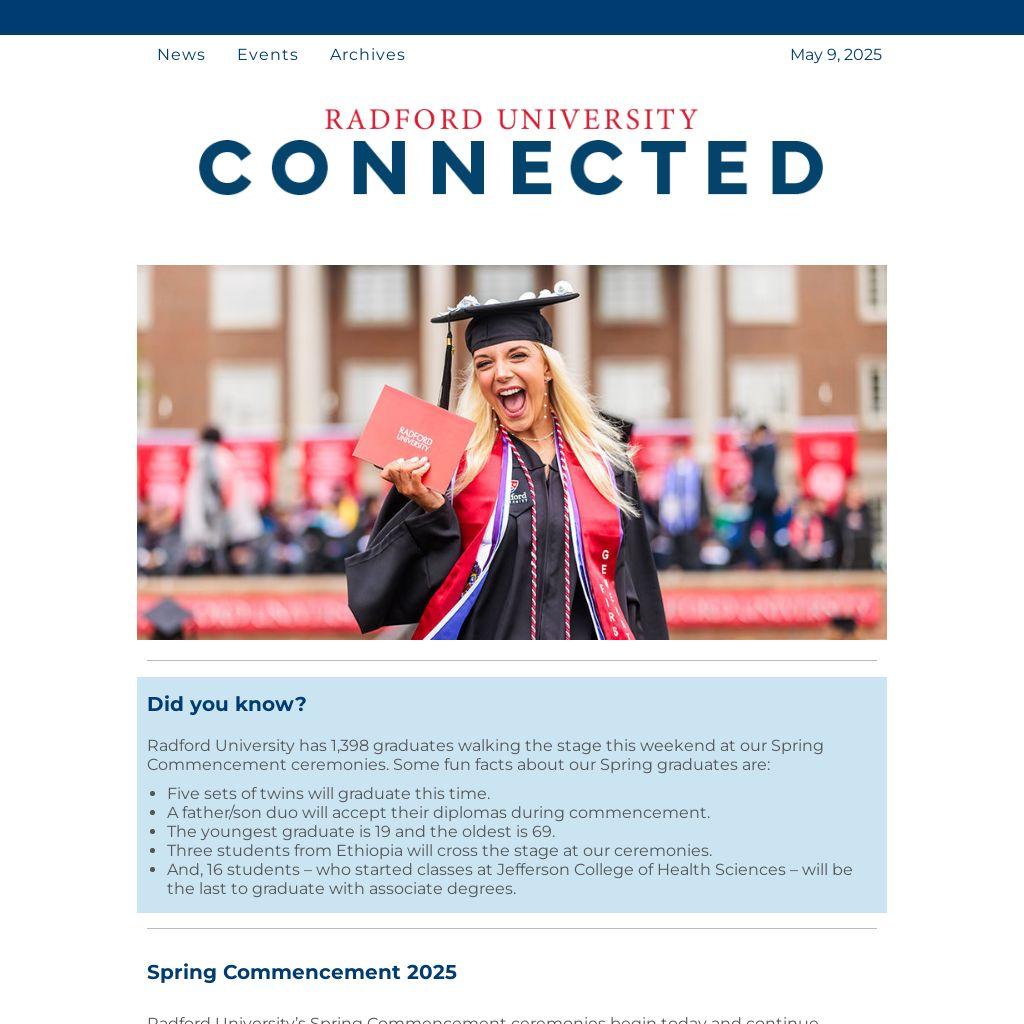 Radford University has 1,398 graduates walking the stage this weekend at our Spring Commencement ceremonies. Some fun facts about our Spring graduates are: