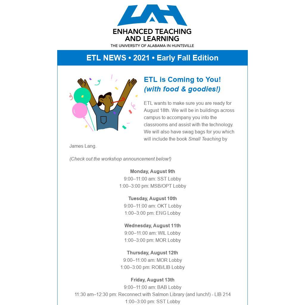 ETL wants to make sure you are ready for August 18th. We will be in buildings across campus to accompany you into the classrooms and assist with the technology. We will also have swag bags for you which will include the book Small Teaching by James Lang.