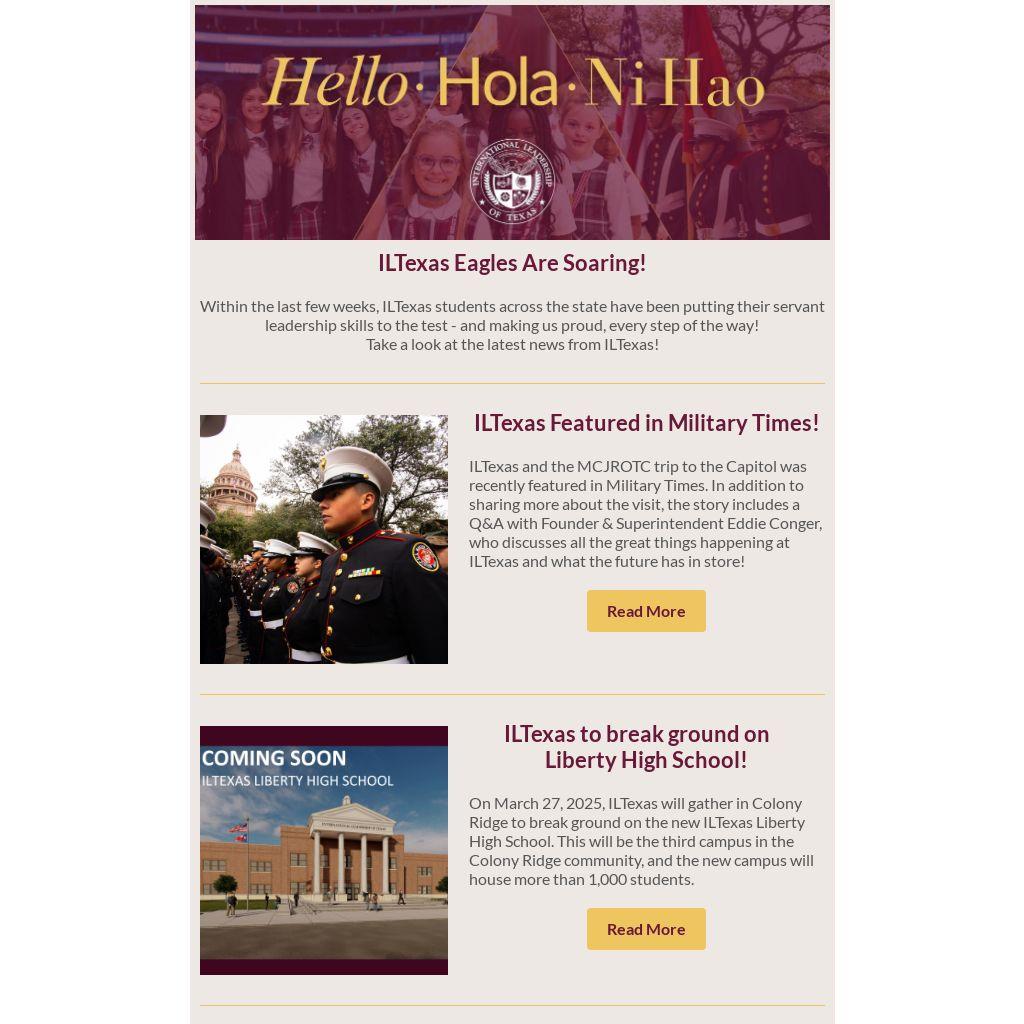 ILTexas is a free public charter school serving over 25,000 K-12 students across 26 campuses in Dallas-Fort Worth, Houston, Cleveland, and College Station. Founded by Eddie Conger in 2012, our mission is to prepare students for exceptional leadership roles in the international community by emphasizing servant leadership, mastering the English, Spanish, and Chinese languages, and strengthening the mind, body and character.