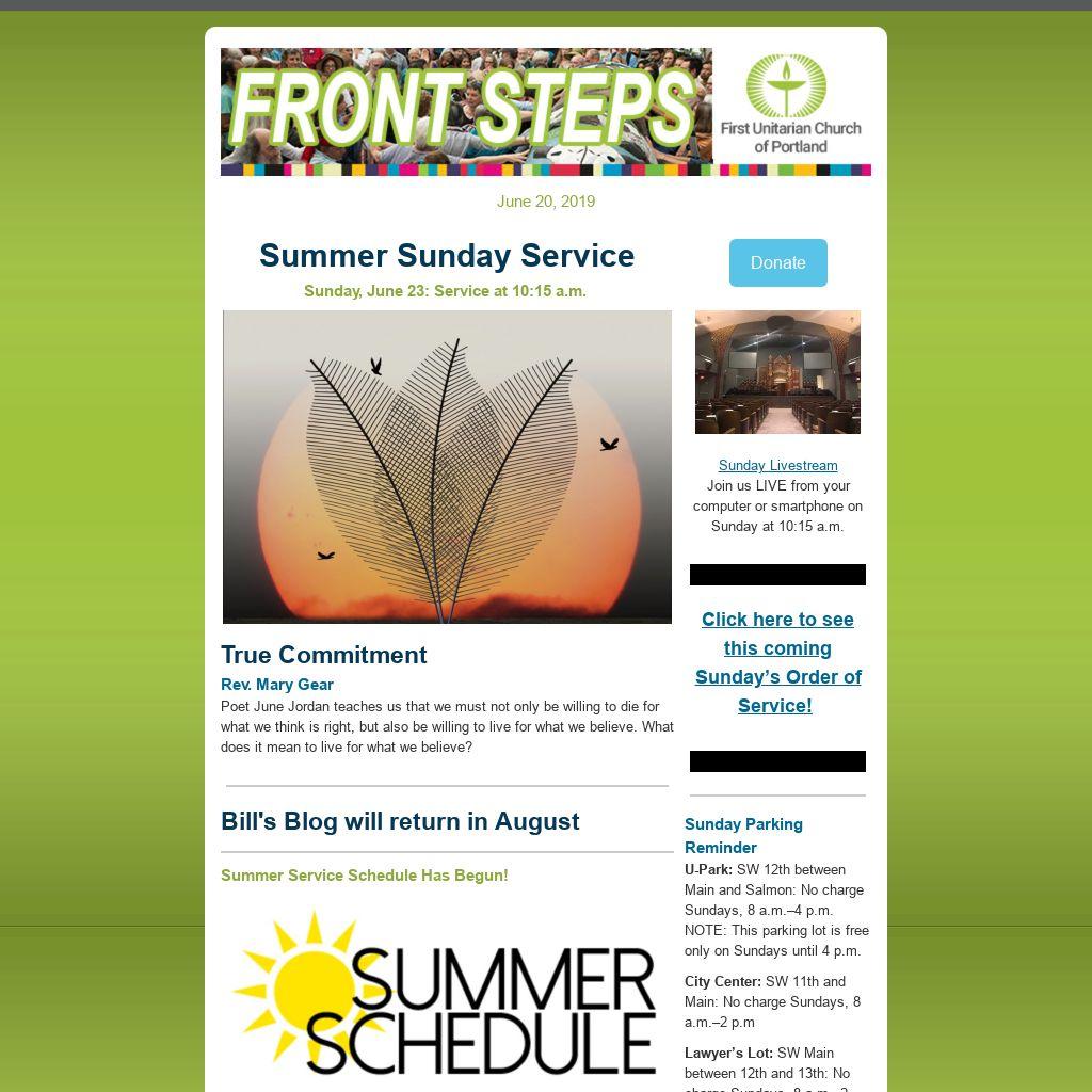 Do You Have an Item for E-news and/or the Sunday Bulletin?If you have an item you’d like published in our weekly Front Steps (eNews) or the Sunday Bulletin, please submit it to: