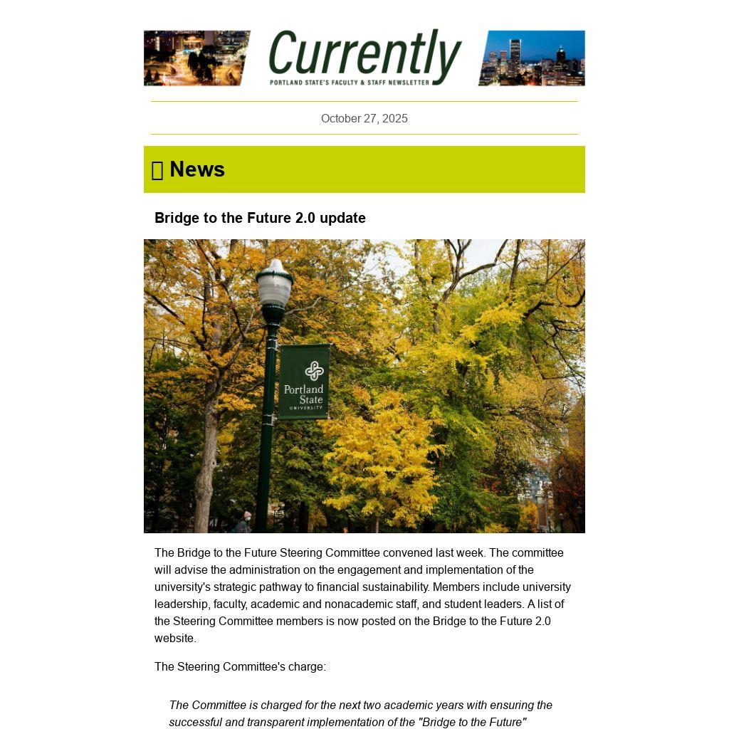CURRENTLY is a weekly newsletter for the employees of Portland State University, published by University Communications. News items, events and accolades should be sent to currently@pdx.edu. Deadline is noon, the Tuesday before publication. See the Currently website for submission guidelines and schedule.