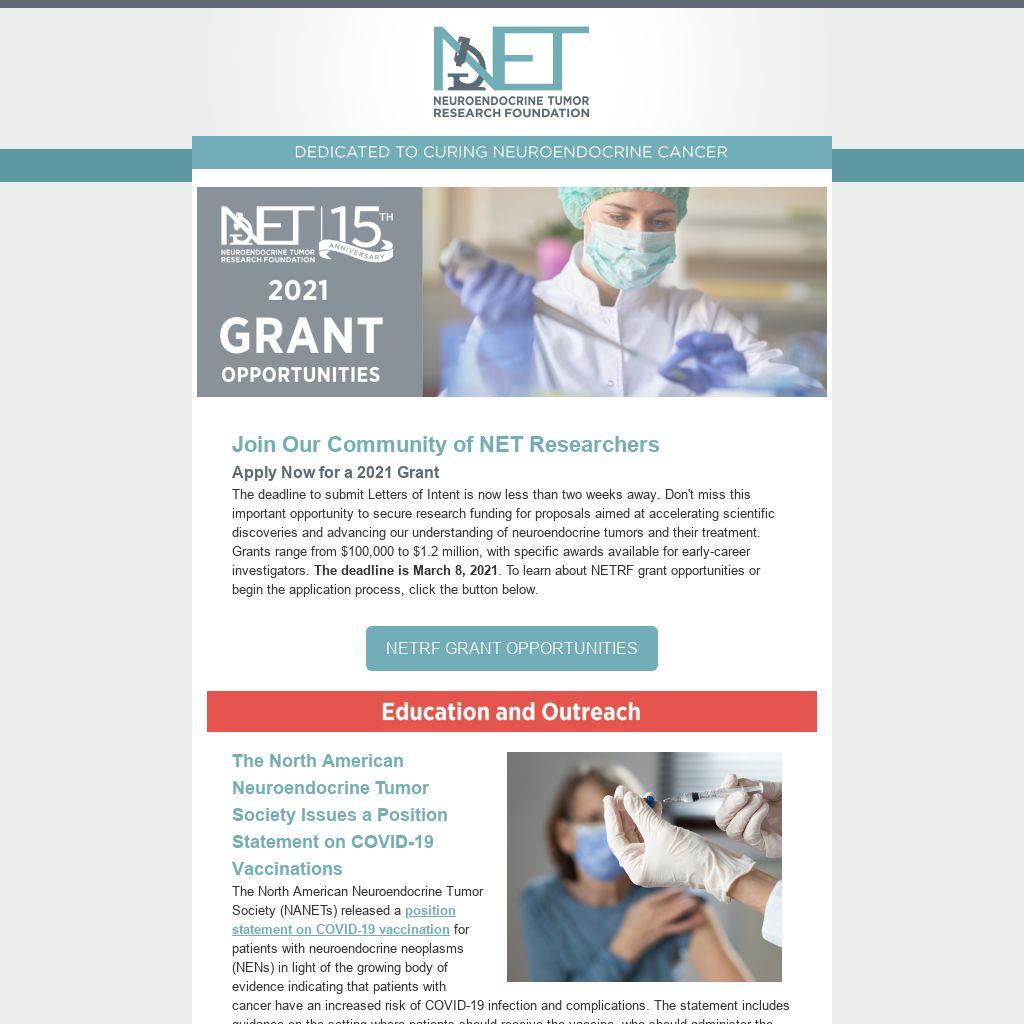 Apply Now for a 2021 GrantThe deadline to submit Letters of Intent is now less than two weeks away. Don't miss this important opportunity to secure research funding for proposals aimed at accelerating scientific discoveries and advancing our understanding of neuroendocrine tumors and their treatment. Grants range from $100,000 to $1.2 million, with specific awards available for early-career investigators. The deadline is March 8, 2021. To learn about NETRF grant opportunities or begin the application process, click the button below.