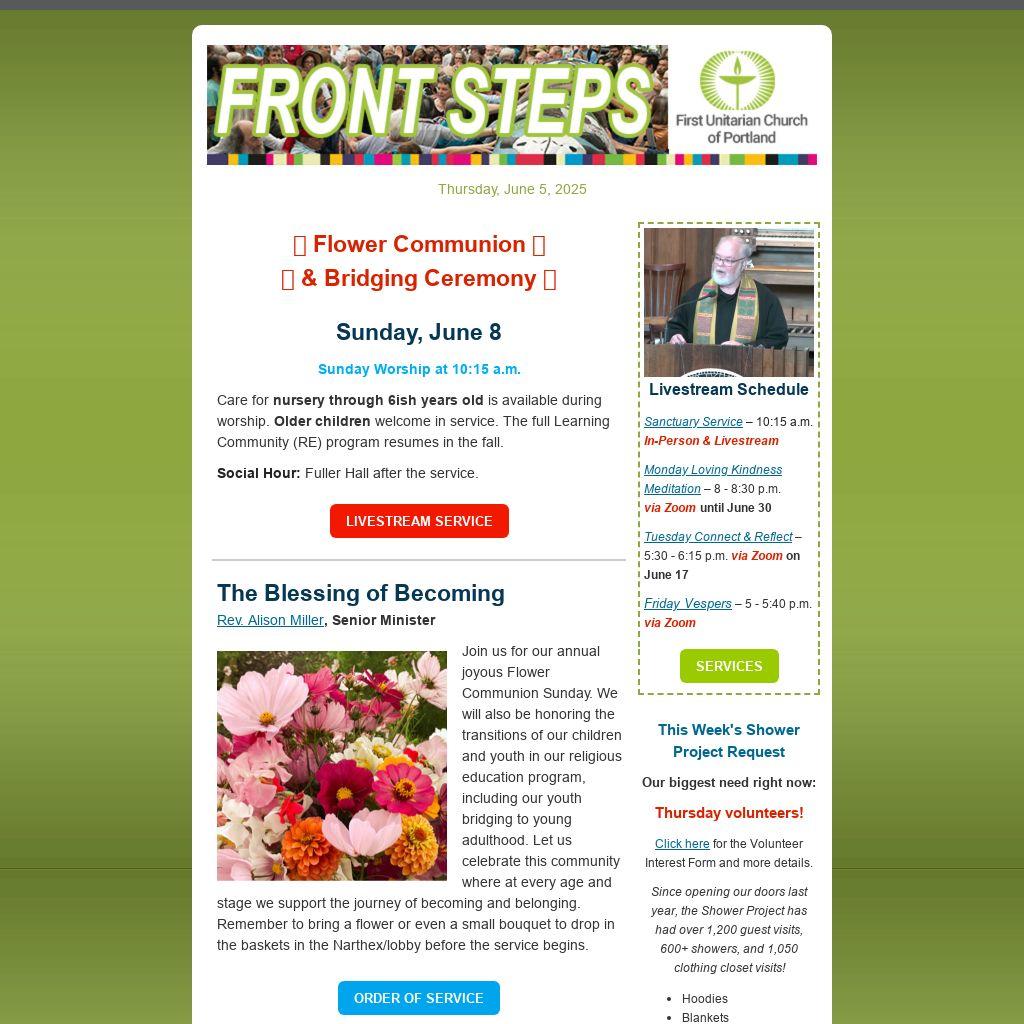 Flowers can be dropped off at our Salmon St. entrance tomorrow/Friday, June 6, between 9 a.m. and 11 a.m. Flowers used in the ordination will be used on Sunday for our annual flower communion.