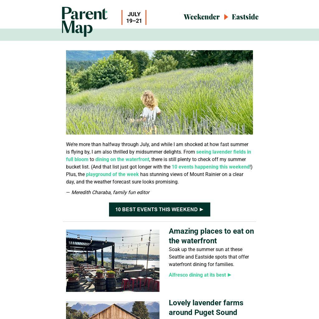 We’re more than halfway through July, and while I am shocked at how fast summer is flying by, I am also thrilled by midsummer delights. From seeing lavender fields in full bloom to dining on the waterfront, there is still plenty to check off my summer bucket list. (And that list just got longer with the 10 events happening this weekend!) Plus, the playground of the week has stunning views of Mount Rainier on a clear day, and the weather forecast sure looks promising.