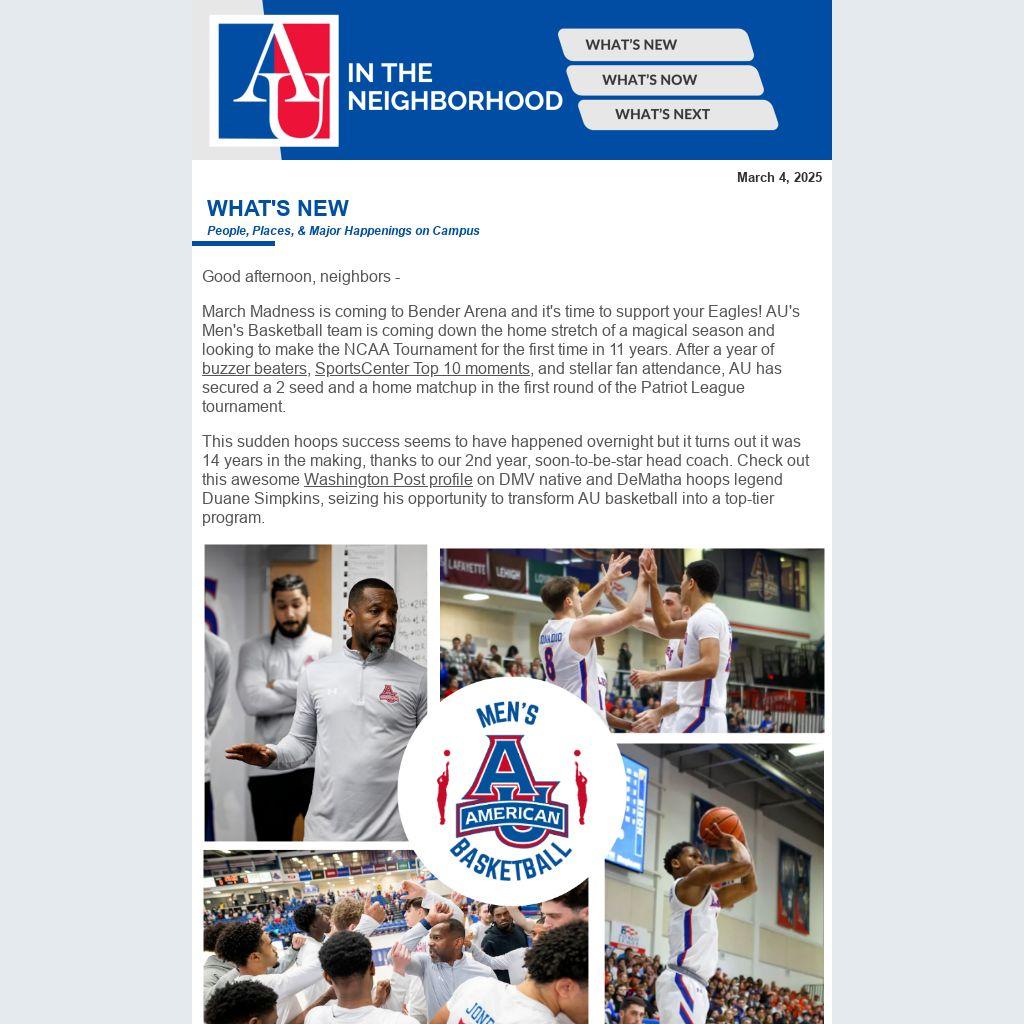 March Madness is coming to Bender Arena and it's time to support your Eagles! AU's Men's Basketball team is coming down the home stretch of a magical season and looking to make the NCAA Tournament for the first time in 11 years. After a year of buzzer beaters, SportsCenter Top 10 moments, and stellar fan attendance, AU has secured a 2 seed and a home matchup in the first round of the Patriot League tournament.