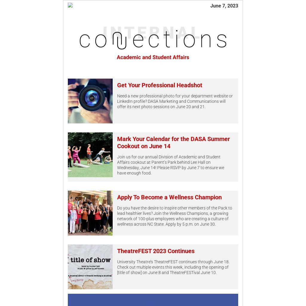 - The fall crowdfunding application is due June 23. If you have a project you’d like to submit, please connect with Shaina Waterhouse at swaterh@ncsu.edu.