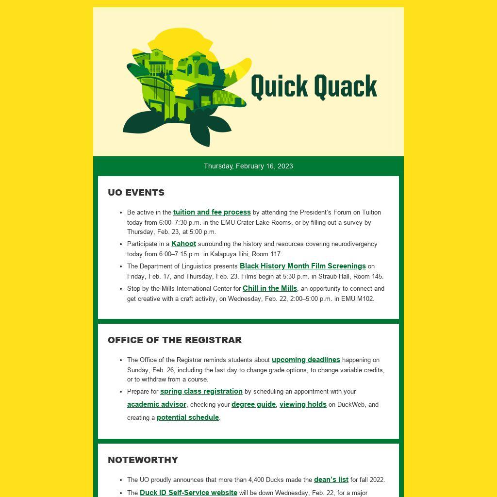 - Be active in the tuition and fee process by attending the President’s Forum on Tuition today from 6:00–7:30 p.m. in the EMU Crater Lake Rooms, or by filling out a survey by Thursday, Feb. 23, at 5:00 p.m.