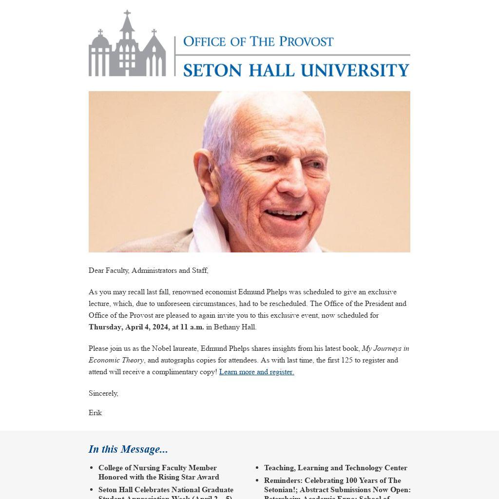 As you may recall last fall, renowned economist Edmund Phelps was scheduled to give an exclusive lecture, which, due to unforeseen circumstances, had to be rescheduled. The Office of the President and Office of the Provost are pleased to again invite you to this exclusive event, now scheduled for Thursday, April 4, 2024, at 11 a.m. in Bethany Hall.