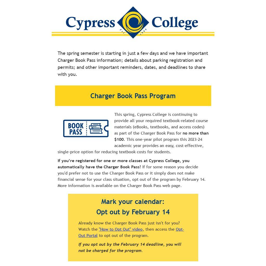 If you’re registered for one or more classes at Cypress College, you automatically have the Charger Book Pass! If for some reason you decide you'd prefer not to use the Charger Book Pass or it simply does not make financial sense for your class situation, opt out of the program by February 14. More information is available on the Charger Book Pass web page.