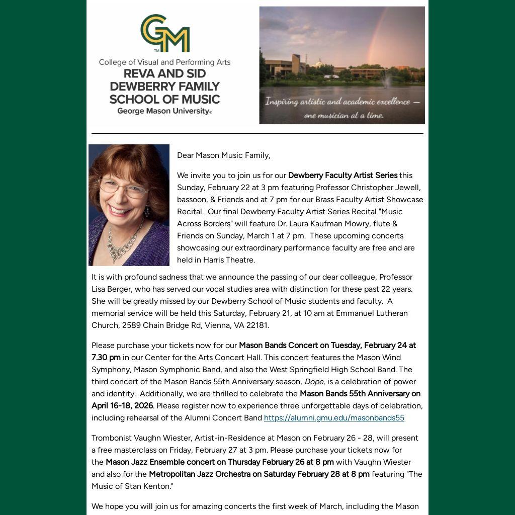 It is with profound sadness that we announce the passing of our dear colleague, Professor Lisa Berger, who has served our vocal studies area with distinction for these past 22 years. She will be greatly missed by our Dewberry School of Music students and faculty. A memorial service will be held this Saturday, February 21, at 10 am at Emmanuel Lutheran Church, 2589 Chain Bridge Rd, Vienna, VA 22181.