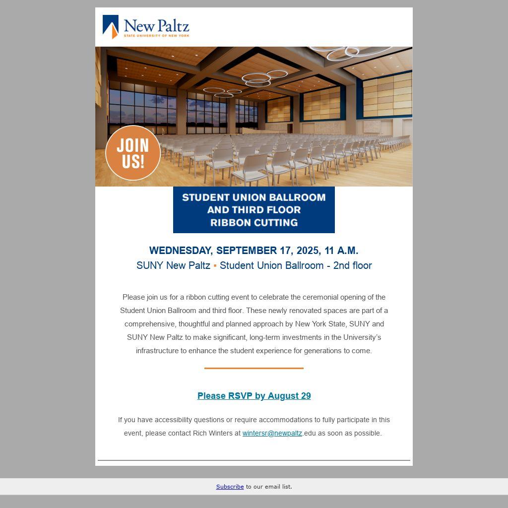 Please join us for a ribbon cutting event to celebrate the ceremonial opening of the Student Union Ballroom and third floor. These newly renovated spaces are part of a comprehensive, thoughtful and planned approach by New York State, SUNY and SUNY New Paltz to make significant, long-term investments in the University’s infrastructure to enhance the student experience for generations to come.