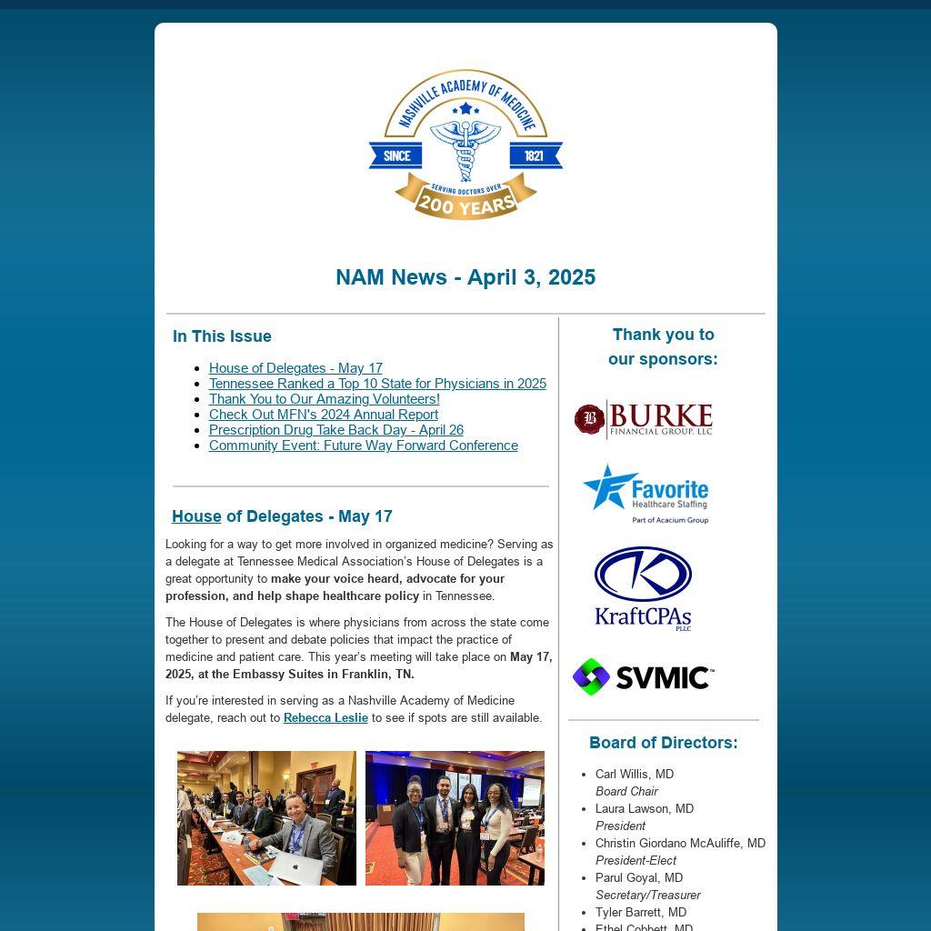 If you’re interested in serving as a Nashville Academy of Medicine delegate, reach out to Rebecca Leslie to see if spots are still available.
