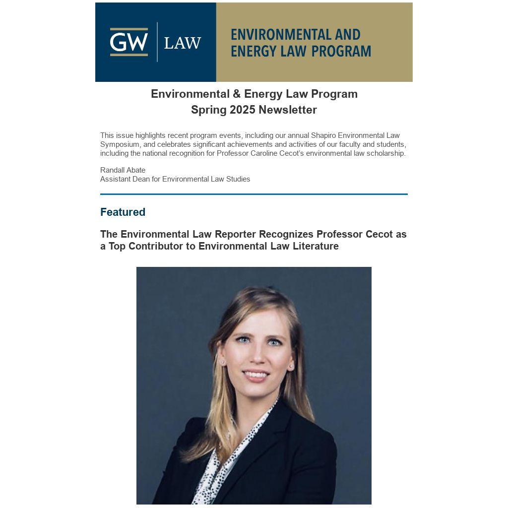 Each year, the Environmental Law Reporter, in partnership with Vanderbilt University Law School, publishes a report evaluating recent scholarship in environmental law. The Analysis of Environmental Law Scholarship for 2022-2023, published in 2024, identifies the "Top 20" environmental law articles, selected based on persuasiveness, impact, feasibility, and creativity. GW Law’s Environmental and Energy Law program is proud to share that Professor Cecot’s article, Efficiency and Equity in Regulation, 76 Vand. L. Rev. 361 (2023), was recognized as one of the Top 20. Congratulations to Professor Cecot on this prestigious honor! Our summer newsletter will feature a full story on Professor Cecot joining the Environmental and Energy Law Faculty in August 2025.