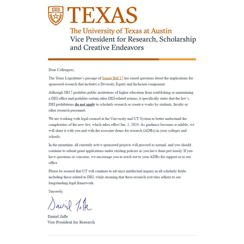 Please be assured that UT will continue to advance intellectual inquiry in all scholarly fields, including those related to DEI, while ensuring that these research activities adhere to our longstanding legal framework.