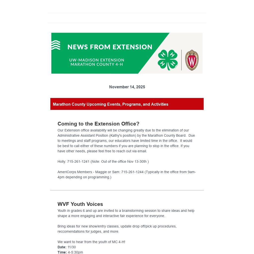 Our Extension office availability will be changing greatly due to the elimination of our Administrative Assistant Position (Kathy's position) by the Marathon County Board. Due to meetings and staff programs, our educators have limited time in the office. It would be best to call either of these numbers if you are planning to stop in the office. If you have other needs, please feel free to reach out via email.