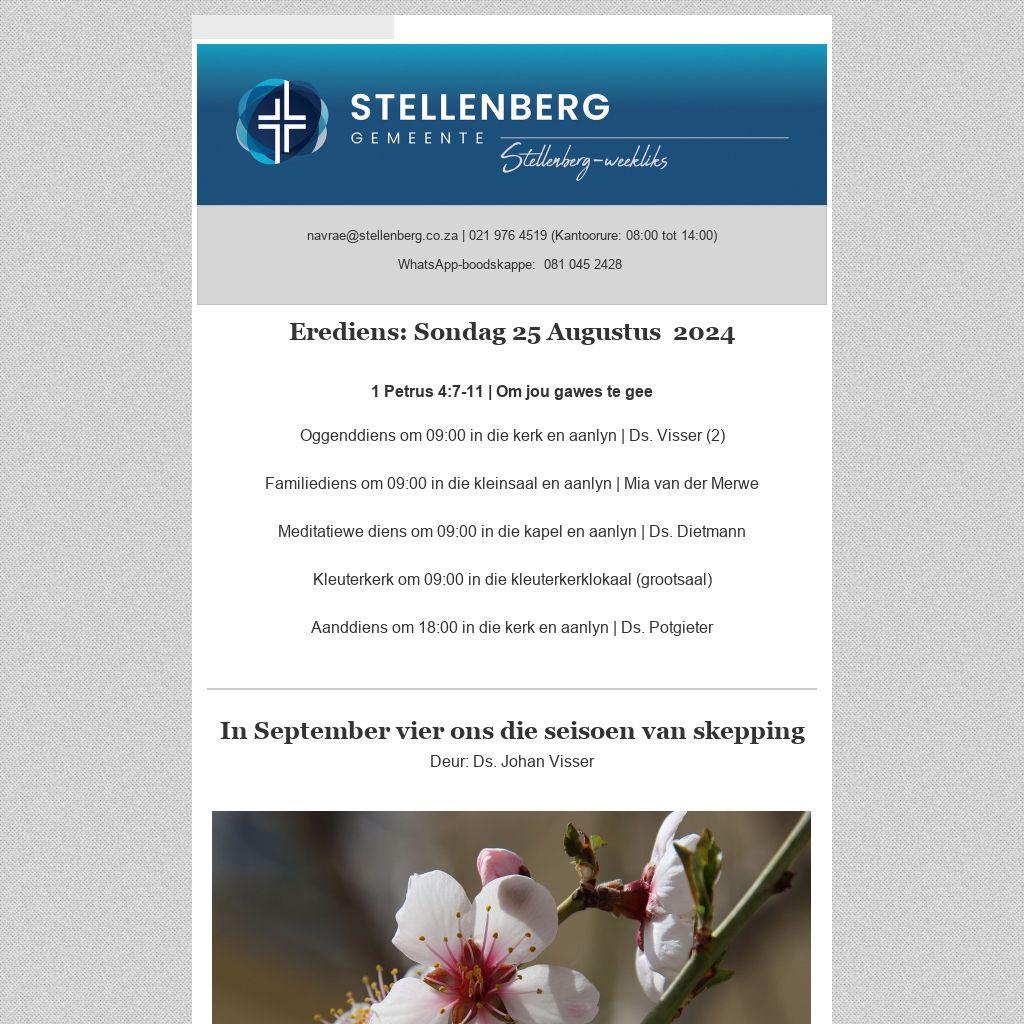 Jy kan gemeentenuus weekliks deur middel van die Stellenberg-weekliks per e-pos ontvang. Stuur jou e-posadres aan sanel@stellenberg.co.za. - Op jou selfoon: