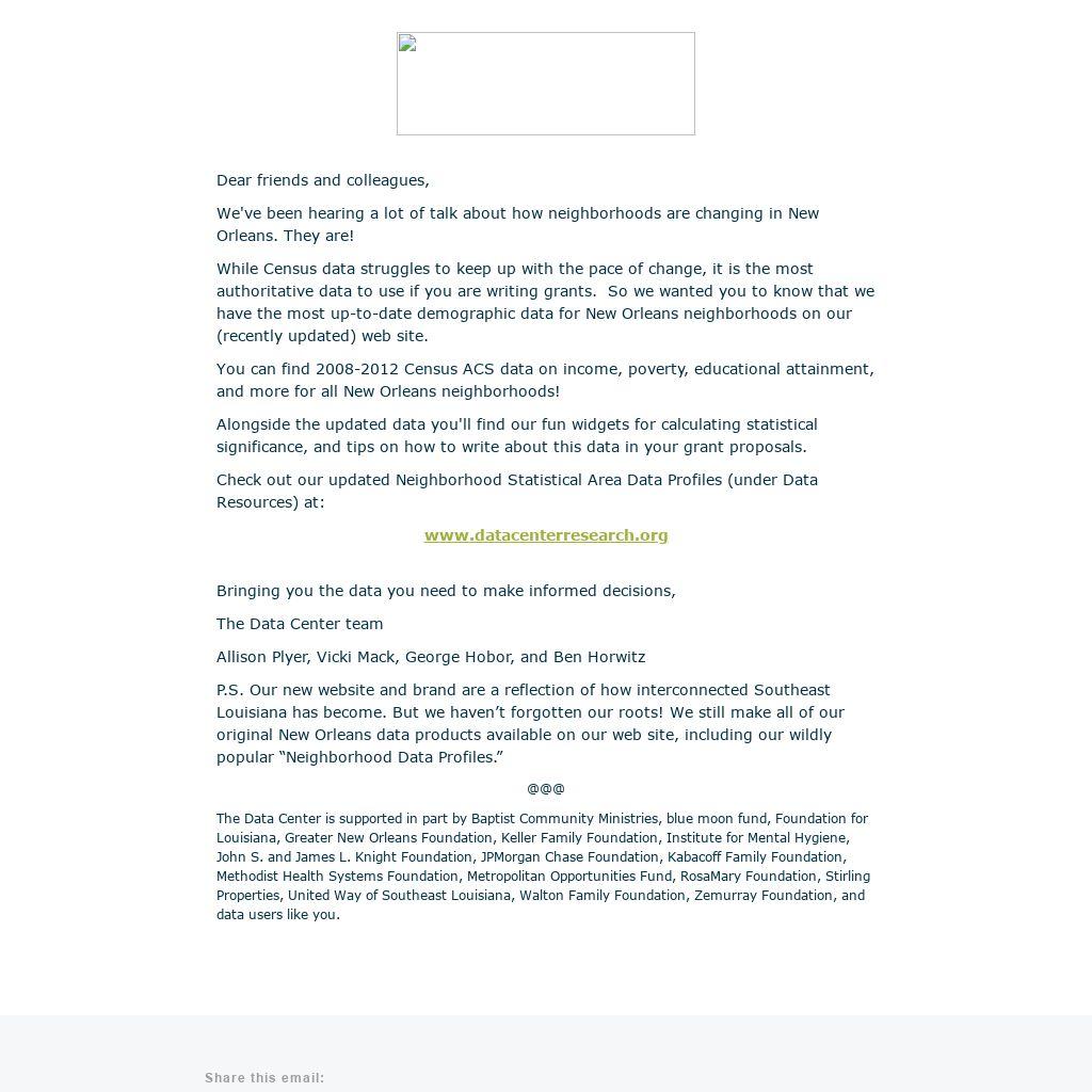 The Data Center is supported in part by Baptist Community Ministries, blue moon fund, Foundation for Louisiana, Greater New Orleans Foundation, Keller Family Foundation, Institute for Mental Hygiene, John S. and James L. Knight Foundation, JPMorgan Chase Foundation, Kabacoff Family Foundation, Methodist Health Systems Foundation, Metropolitan Opportunities Fund, RosaMary Foundation, Stirling Properties, United Way of Southeast Louisiana, Walton Family Foundation, Zemurray Foundation, and data users like you.