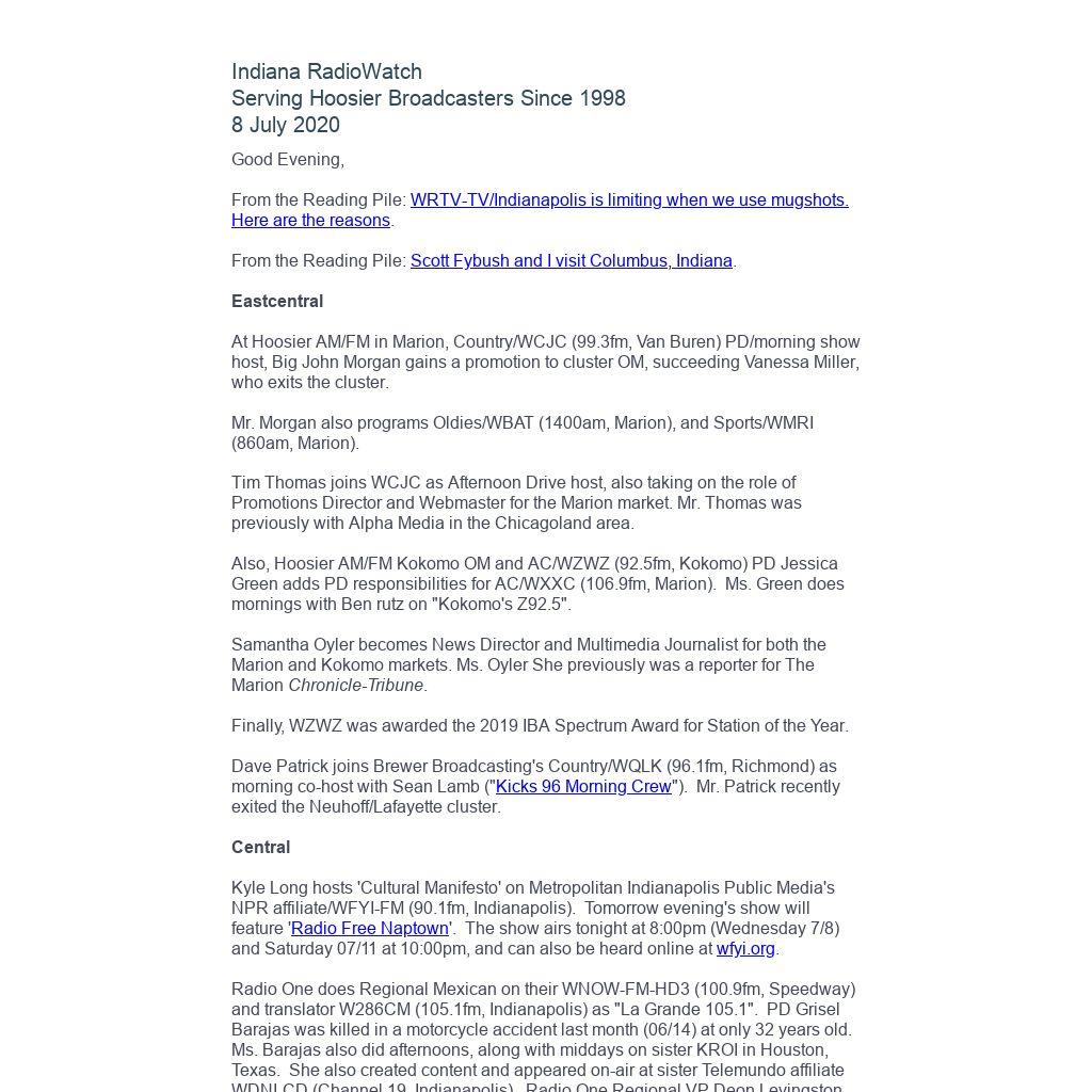 Indiana RadioWatch subscriptions are free. To subscribe, send an e-mail to irw@well.com and we'll add you. After publication, we archive Indiana RadioWatch on the Indiana Radio Archive at indianaradio.net. Please e-mail us your news stories and employment opportunities.