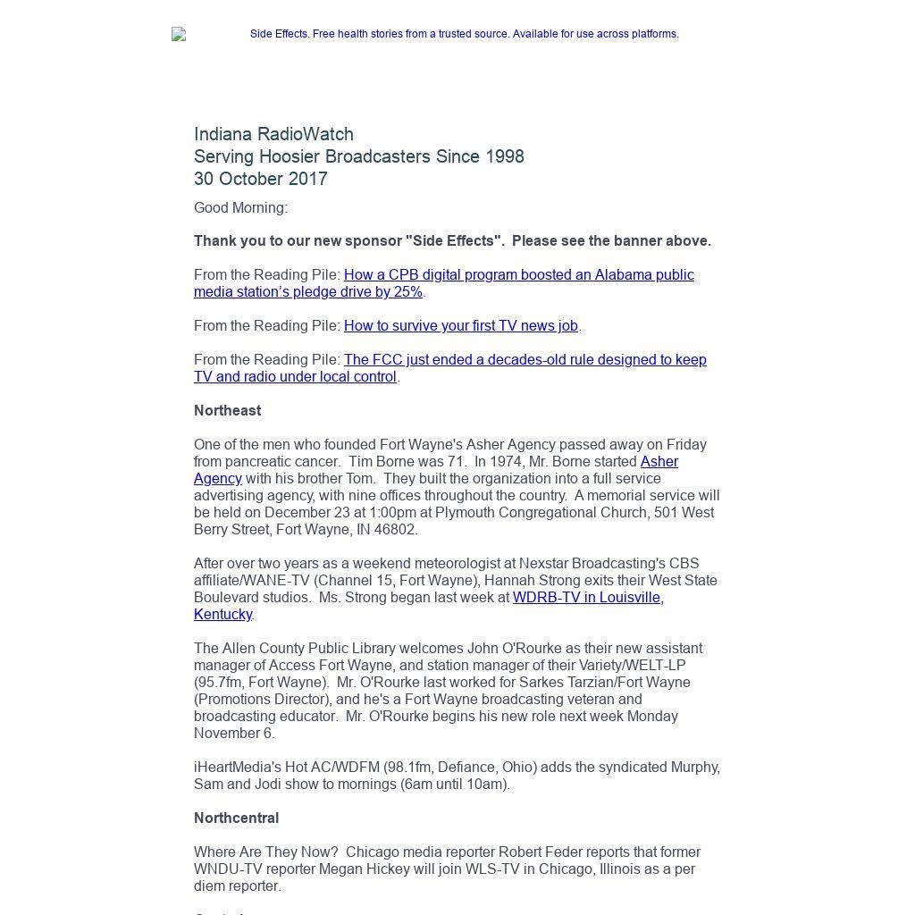 Indiana RadioWatch subscriptions are free. To subscribe, send an e-mail to irw@well.com and we'll add you. After publication, we archive Indiana RadioWatch on the Indiana Radio Archive at http://www.indianaradio.net. Please e-mail us your news stories and employment opportunities.
