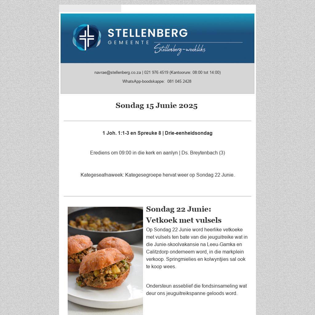 Jy kan gemeentenuus weekliks deur middel van die Stellenberg-weekliks per e-pos ontvang. Stuur jou e-posadres aan sanel@stellenberg.co.za. - Op jou selfoon:
