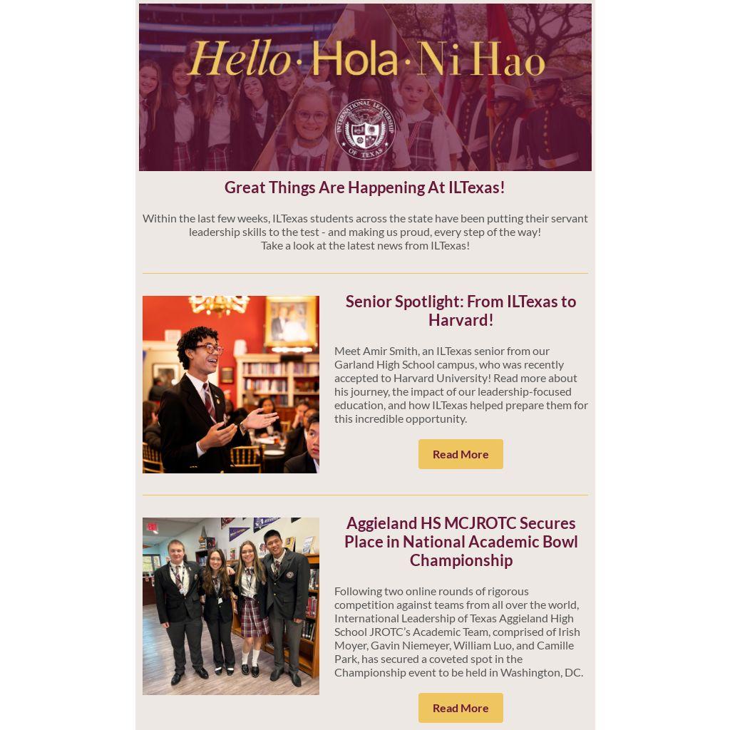ILTexas is a free public charter school serving over 25,000 K-12 students across 26 campuses in Dallas-Fort Worth, Houston, Cleveland, and College Station. Founded by Eddie Conger in 2012, our mission is to prepare students for exceptional leadership roles in the international community by emphasizing servant leadership, mastering the English, Spanish, and Chinese languages, and strengthening the mind, body and character.