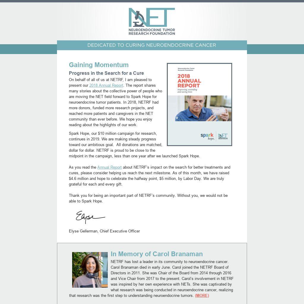 Gaining MomentumProgress in the Search for a CureOn behalf of all of us at NETRF, I am pleased to present our 2018 Annual Report. The report shares many stories about the collective power of people who are moving the NET field forward to Spark Hope for neuroendocrine tumor patients. In 2018, NETRF had more donors, funded more research projects, and reached more patients and caregivers in the NET community than ever before. We hope you enjoy reading about the highlights of our work.