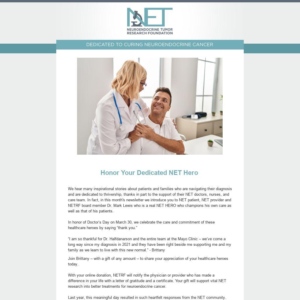Last year, this meaningful day resulted in such heartfelt responses from the NET community. We invite you to join us again to honor your physician for Doctor's Day and support NETRF at the same time. Thank you.