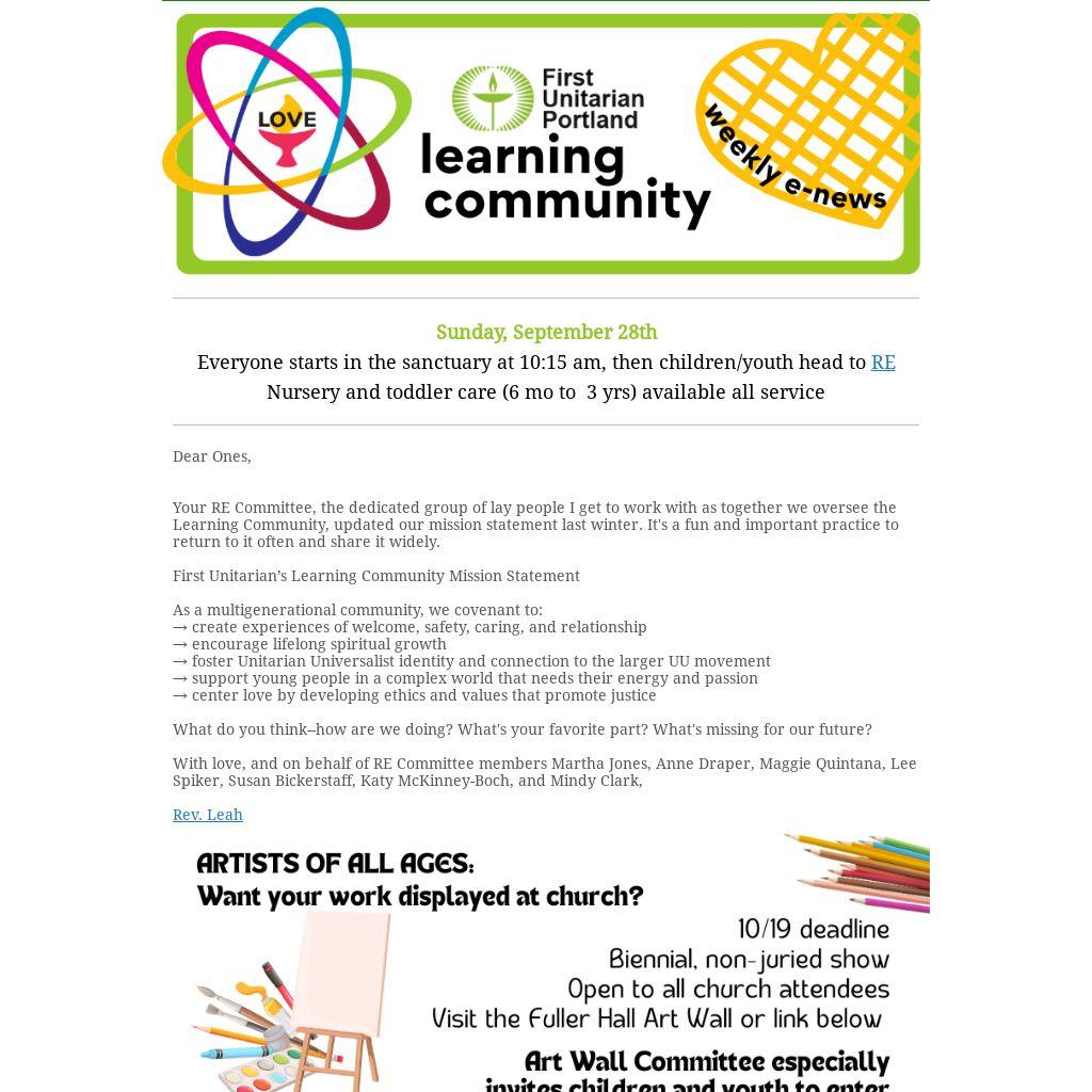 Your RE Committee, the dedicated group of lay people I get to work with as together we oversee the Learning Community, updated our mission statement last winter. It's a fun and important practice to return to it often and share it widely.