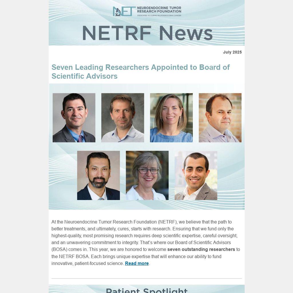 At the Neuroendocrine Tumor Research Foundation (NETRF), we believe that the path to better treatments, and ultimately, cures, starts with research. Ensuring that we fund only the highest-quality, most promising research requires deep scientific expertise, careful oversight, and an unwavering commitment to integrity. That’s where our Board of Scientific Advisors (BOSA) comes in. This year, we are honored to welcome seven outstanding researchers to the NETRF BOSA. Each brings unique expertise that will enhance our ability to fund innovative, patient-focused science. Read more.