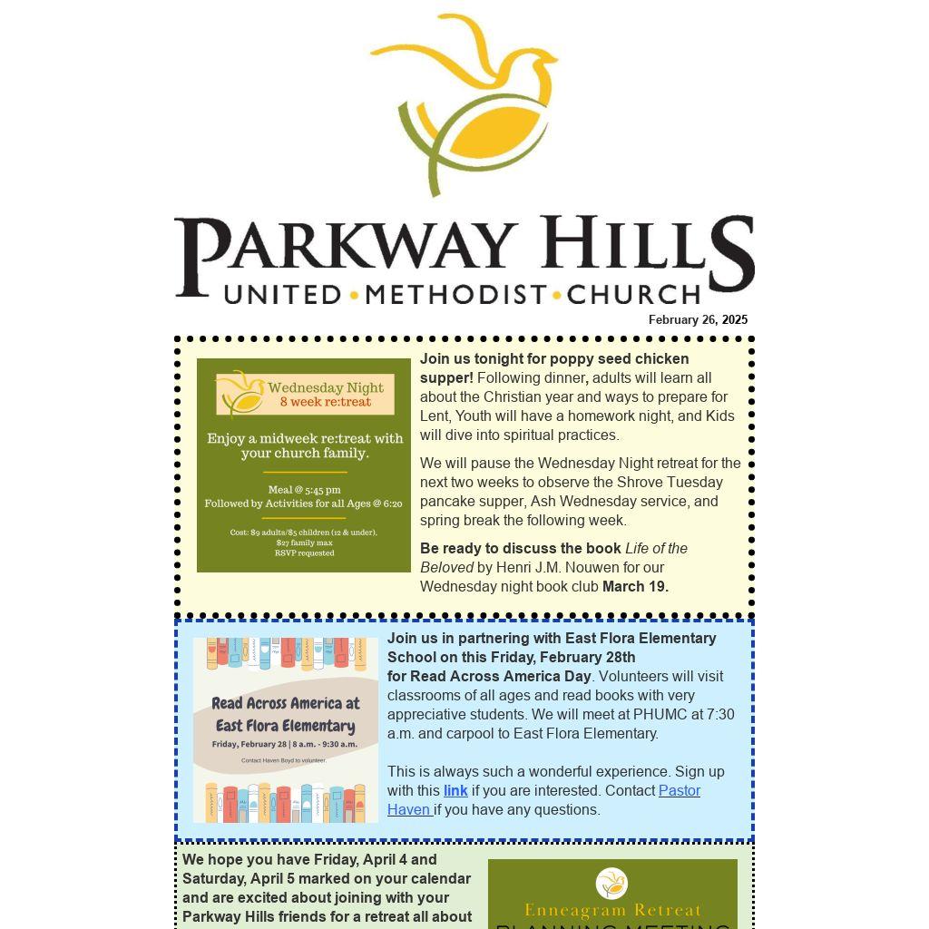 We hope you have Friday, April 4 and Saturday, April 5 marked on your calendar and are excited about joining with your Parkway Hills friends for a retreat all about the enneagram. What is the enneagram? Well, the short definition is a system of nine personality types that reveals your core motivations and how you relate to others. The long definition, well, come to the retreat for that! Don’t care about the enneagram but want to connect and fellowship with others, eat some good food, possibly win a door prize? Then come to the retreat for that! If you would like to help plan the retreat, join Pastor Dawn, Jessica Snyder, Susan Taylor and Jackie Buck, and Connie Starkey Sunday, March 2 immediately following worship. If you haven’t registered for the retreat, click here.