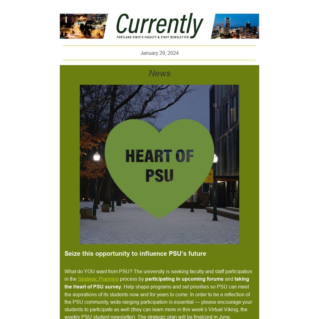 CURRENTLY is Portland State University's weekly faculty and staff newsletter. It is published by University Communications every Monday during the academic year. News items should be emailed by noon the Tuesday before publication. See the Currently website for submission guidelines and schedule.