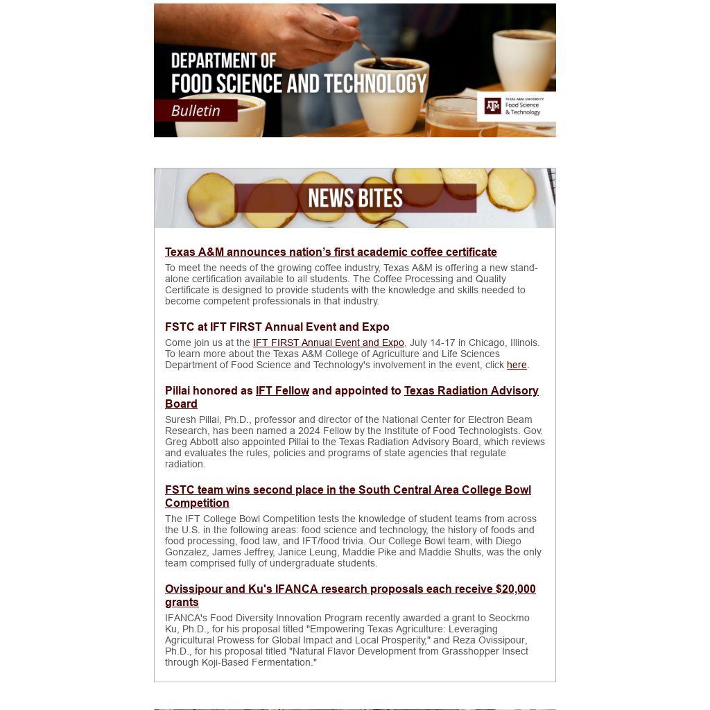 Come join us at the IFT FIRST Annual Event and Expo, July 14-17 in Chicago, Illinois. To learn more about the Texas A&M College of Agriculture and Life Sciences Department of Food Science and Technology's involvement in the event, click here.
