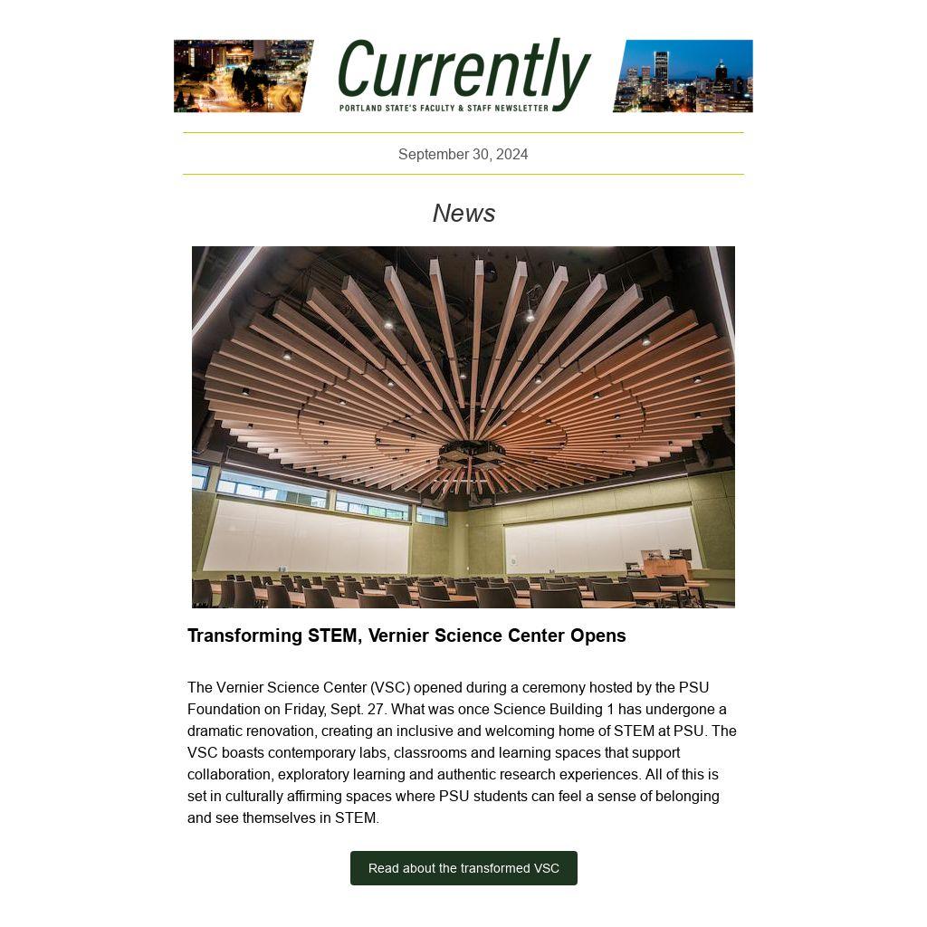 CURRENTLY is a weekly newsletter for the employees of Portland State University, published by University Communications. News items, events and accolades should be sent to currently@pdx.edu. Deadline is noon, the Tuesday before publication. See the Currently website for submission guidelines and schedule.