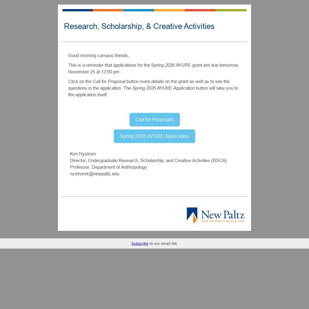 This is a reminder that applications for the Spring 2026 AYURE grant are due tomorrow, November 25 at 12:00 pm.