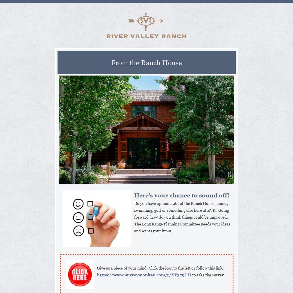 Here's your chance to sound off!Do you have opinions about the Ranch House, tennis, swimming, golf or something else here at RVR? Going forward, how do you think things could be improved? The Long Range Planning Committee needs your ideas and wants your input!