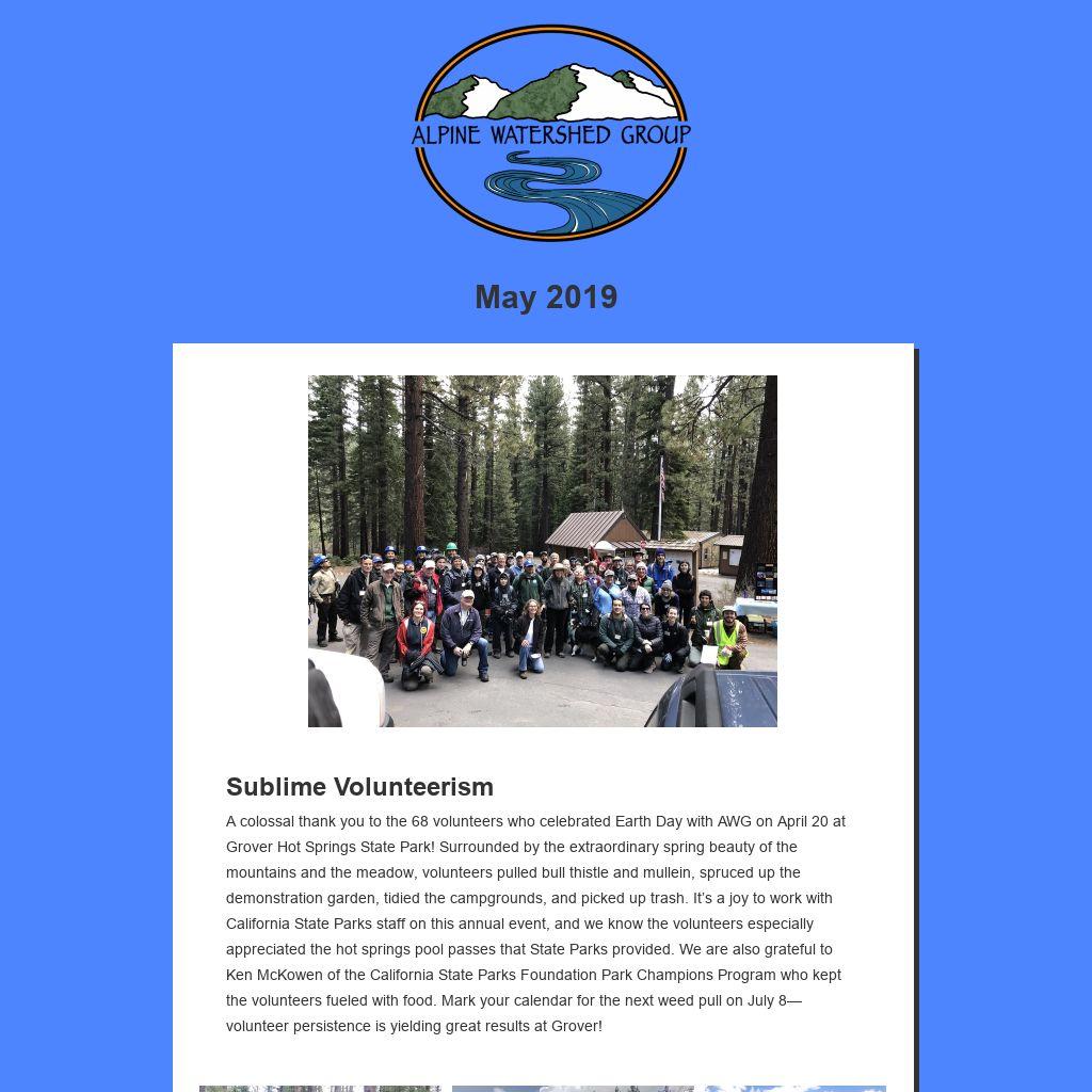 Happy Trails, Healthy Watersheds Please join us for our bimonthly group meeting next Tuesday, May 14, 5:30-7 p.m. at the Hung A Lel Ti Woodfords Indian Education Center. Andy Lovell of Alpine Trails Association and AWG Board Member Zach Wood will be presenting and leading a discussion on “Trails and Watershed Health: How can we work together to enhance recreational opportunities and protect Alpine County’s watersheds?” Please share the flyer and the agenda.