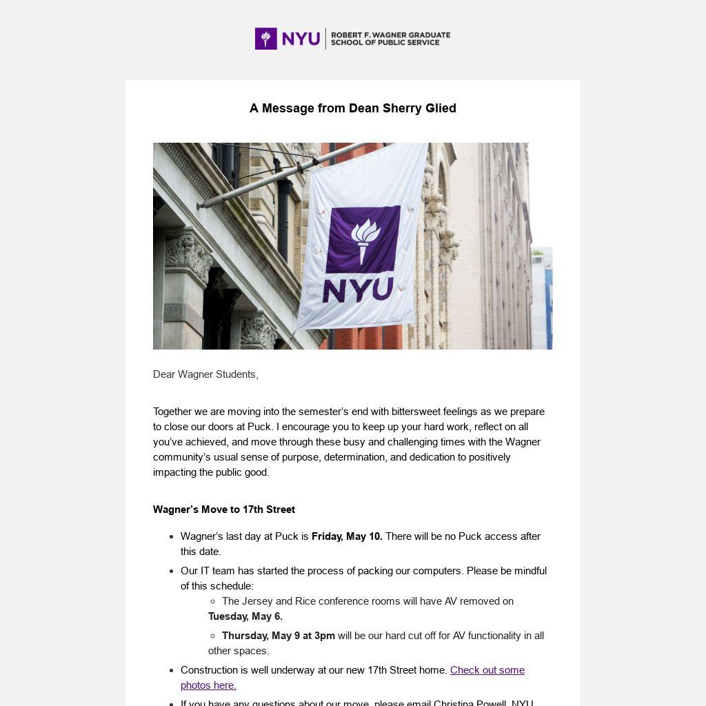 We continue to post these bulletins all in one place. If you have any questions about these bulletins and their contents, please contact NYU Wagner’s Chief of Staff, Christina Powell. You can also always contact me via email.