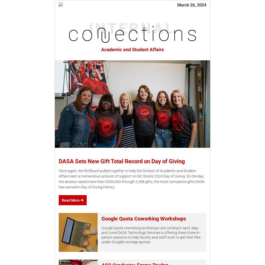 Once again, the Wolfpack pulled together to help the Division of Academic and Student Affairs earn a tremendous amount of support on NC State’s 2024 Day of Giving. On the day, the division raised more than $500,000 through 2,558 gifts, the most cumulative gifts DASA has earned in Day of Giving History.