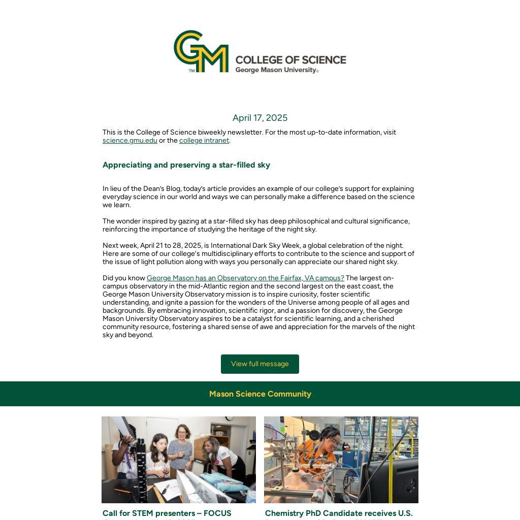Do you have one or two graduating undergraduate or master's students worthy of a shout out? The marketing and communications team would like to spotlight these students and showcase what makes the College of Science a premier choice for STEM education. Email cosnews@gmu.edu with the students' names and why you think they make a great story.