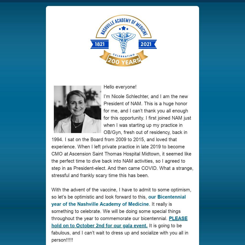 With the advent of the vaccine, I have to admit to some optimism, so let’s be optimistic and look forward to this, our Bicentennial year of the Nashville Academy of Medicine. It really is something to celebrate. We will be doing some special things throughout the year to commemorate our bicentennial. PLEASE hold on to October 2nd for our gala event. It is going to be fabulous, and I can’t wait to dress up and socialize with you all in person!!!!!