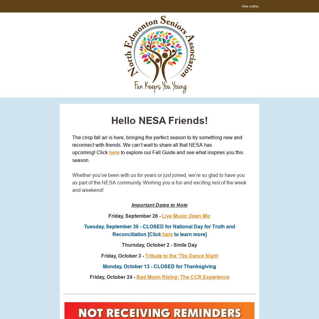 * NESA does not sell tickets on Facebook or Marketplace. NEVER buy tickets for our events unless you are using our official Eventbrite link, visiting us in person, or calling 780-496-6969. Any other offers are scams.