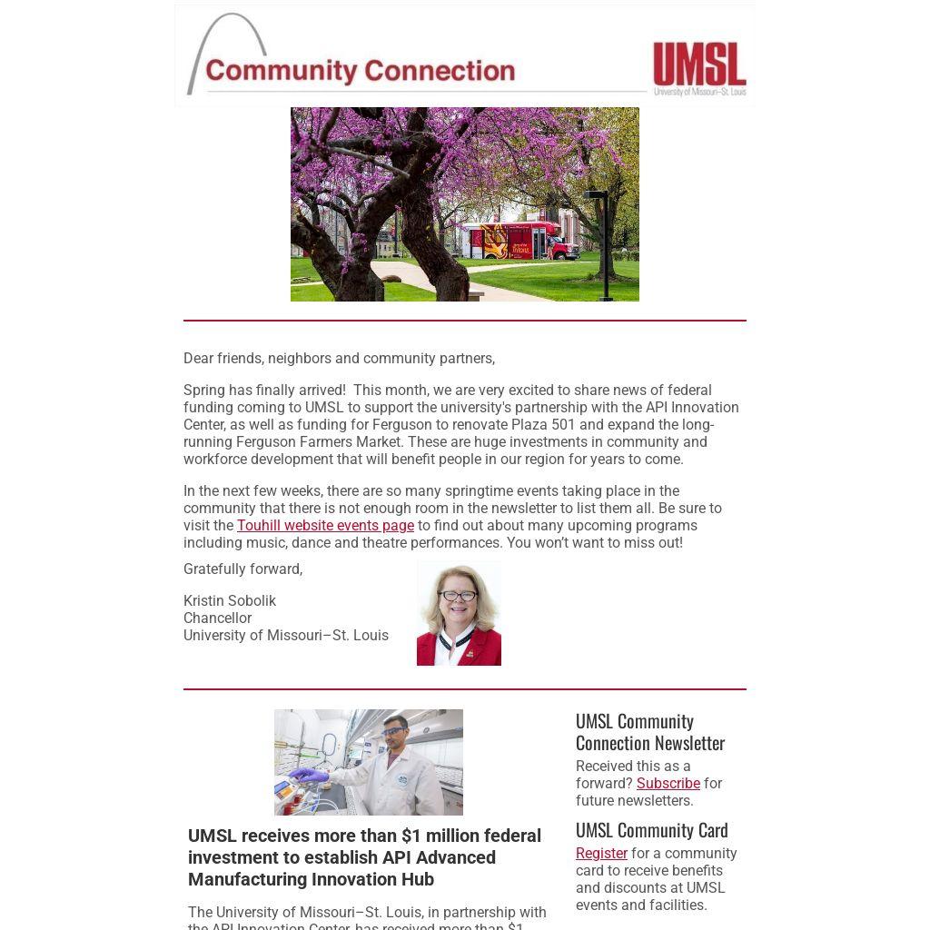 Spring has finally arrived! This month, we are very excited to share news of federal funding coming to UMSL to support the university's partnership with the API Innovation Center, as well as funding for Ferguson to renovate Plaza 501 and expand the long-running Ferguson Farmers Market. These are huge investments in community and workforce development that will benefit people in our region for years to come.