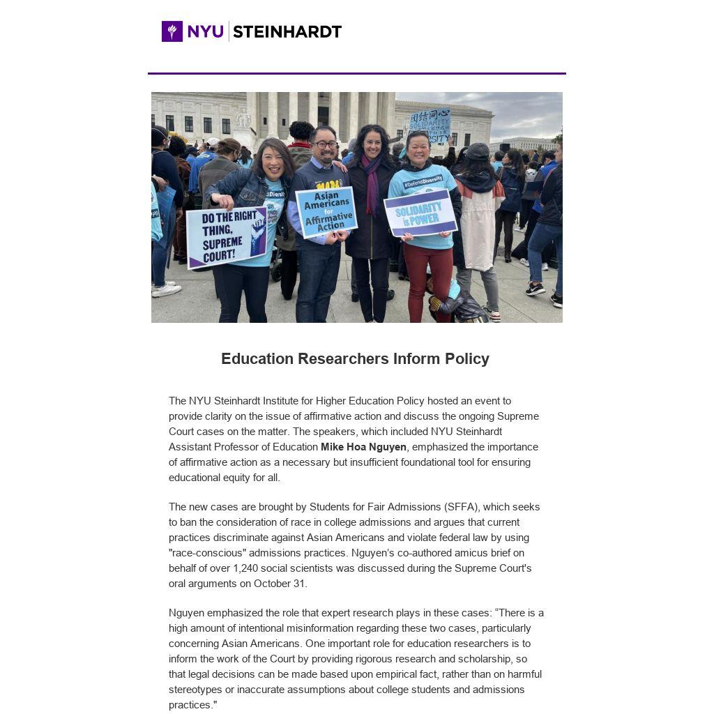 The NYU Steinhardt Institute for Higher Education Policy hosted an event to provide clarity on the issue of affirmative action and discuss the ongoing Supreme Court cases on the matter. The speakers, which included NYU Steinhardt Assistant Professor of Education Mike Hoa Nguyen, emphasized the importance of affirmative action as a necessary but insufficient foundational tool for ensuring educational equity for all.