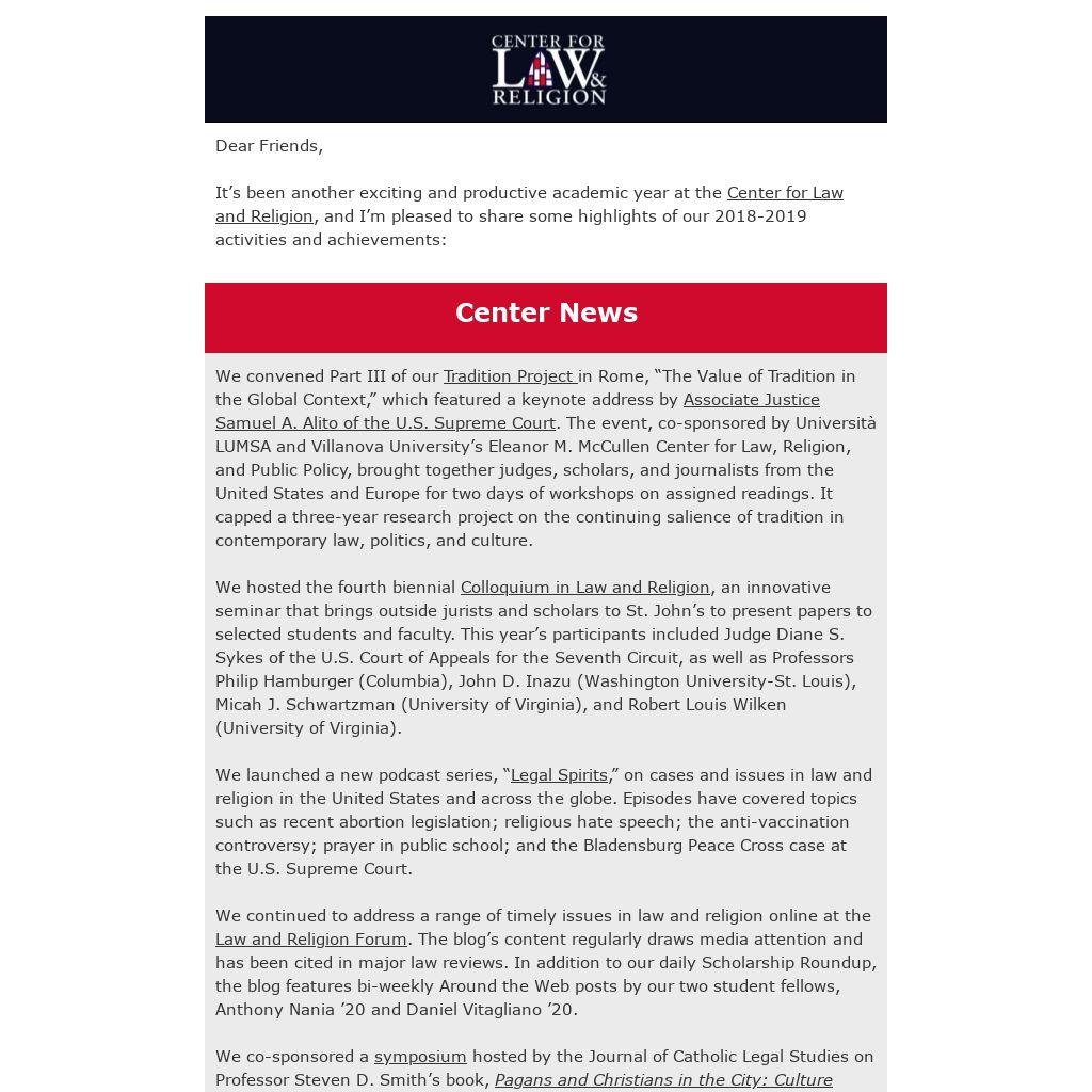 It’s been another exciting and productive academic year at the Center for Law and Religion, and I’m pleased to share some highlights of our 2018-2019 activities and achievements: