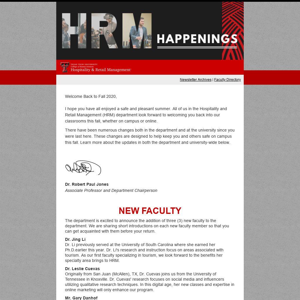 As you can see, we have been busy since you left. If this is your first semester at Texas Tech, we hope it lives up to everything you expected. We are happy to have you in our HRM classes, labs, and learning online. We also look forward to having a safe and healthy semester.