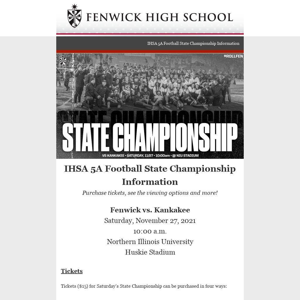 The 5A Championship Game between Fenwick and Kankakee (and all other IHSA football championship games) will air live via Gray Media’s IHSA TV Network (WCIU TheU 26.2 and/or WMEU TheU 48.1 in the Chicago area) on Saturday, November 27.